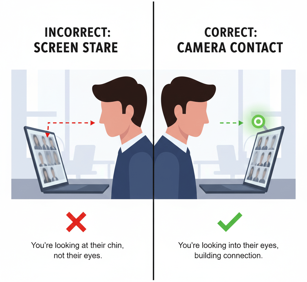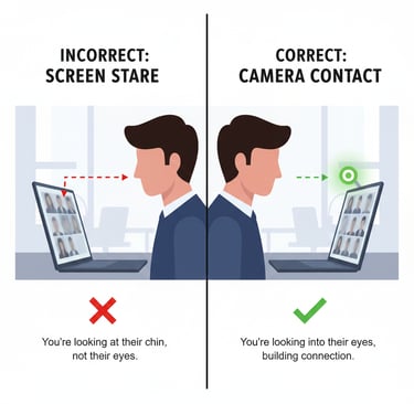 The biggest mistake I see in my coaching sessions is the "Screen Stare." Naturally, we want to look at the faces of our colleagues on the screen. However, when you look at their eyes on your monitor, to them, it looks like you are looking at their chin.